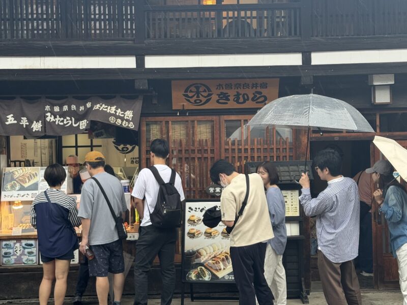 奈良井宿では、香ばしい香りがあちこちから。「木曽奈良井宿きむら」の前には行列ができていました。