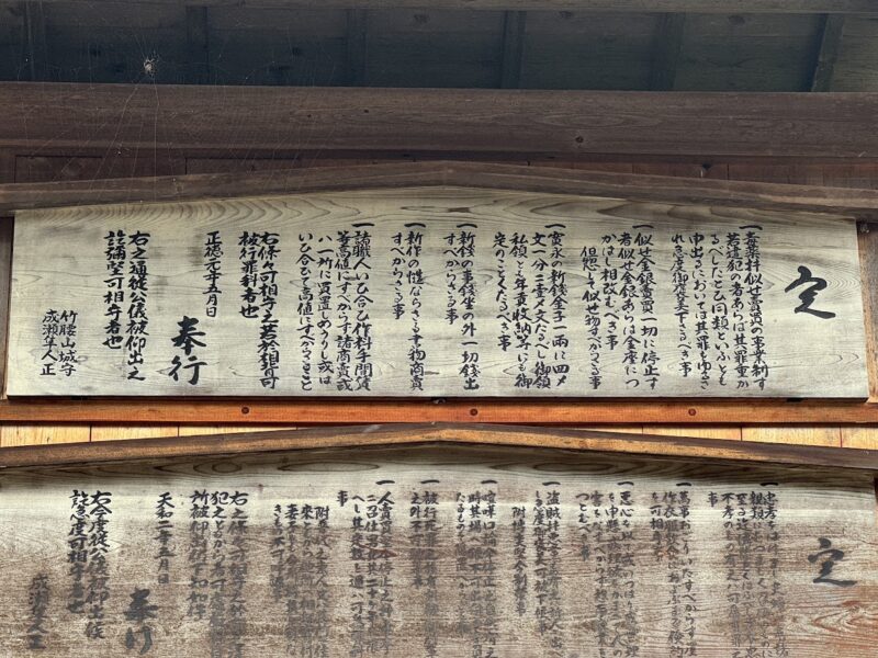 京都側にある高札場は、旅人へのお知らせ版。江戸時代の幕府が定めた法律などを人々に周知させる目的で、お知らせ版に書き掲げていたものです。掟、条目、禁制などが書かれ、江戸時代の情報ステーションでした。