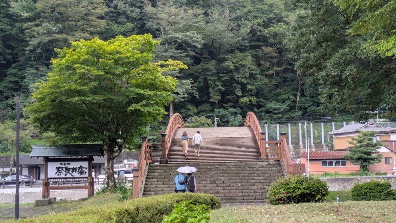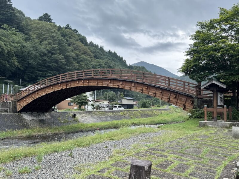 『木曽の大橋』は、木曽のひのきを使って造られた奈良井川に架けられた太鼓型の橋です。村の新しいシンボルです。