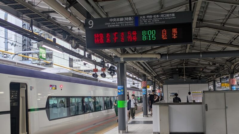 朝のホームに並ぶ「あずさ5号・松本行き」の文字。