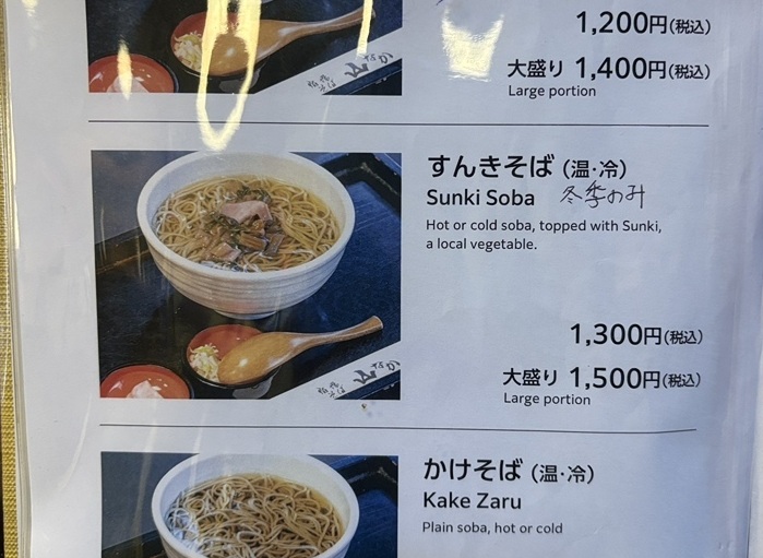 木曽地方の郷土料理である「すんきそば」や、温かい汁に蕎麦をくぐらせて食べる「とうじそば」が人気です。「すんき」とは、塩を使わずに植物性乳酸菌で発行させた漬物で、赤かぶの葉(かぶ菜)を使います。