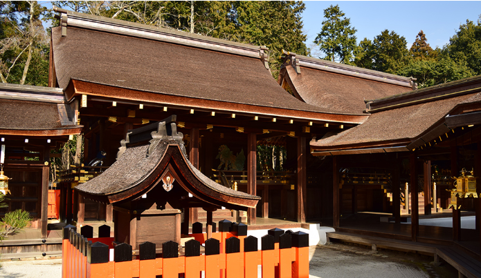 また、上賀茂神社の本殿は「流造(ながれづくり)」と呼ばれる平安初期に成立した日本の神社本殿形式で、正面の屋根が長く流れるように延びた、優雅な曲線が特徴です。檜皮葺の屋根は、扠首(さす)切妻造りで、国宝にも指定されています。全国の神社の約6割が上賀茂神社の本殿形式を採用しているそうです。