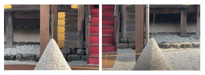 「この世のすべては陰と陽から成り立ち、ふたつが調和することで万物が循環する」という陰陽思想を体現しています。左の砂には松の葉が3本(奇数=陽)、右の砂には2本(偶数=陰)差してあり、世の理(ことわり)が目に見える形で表現されています。
